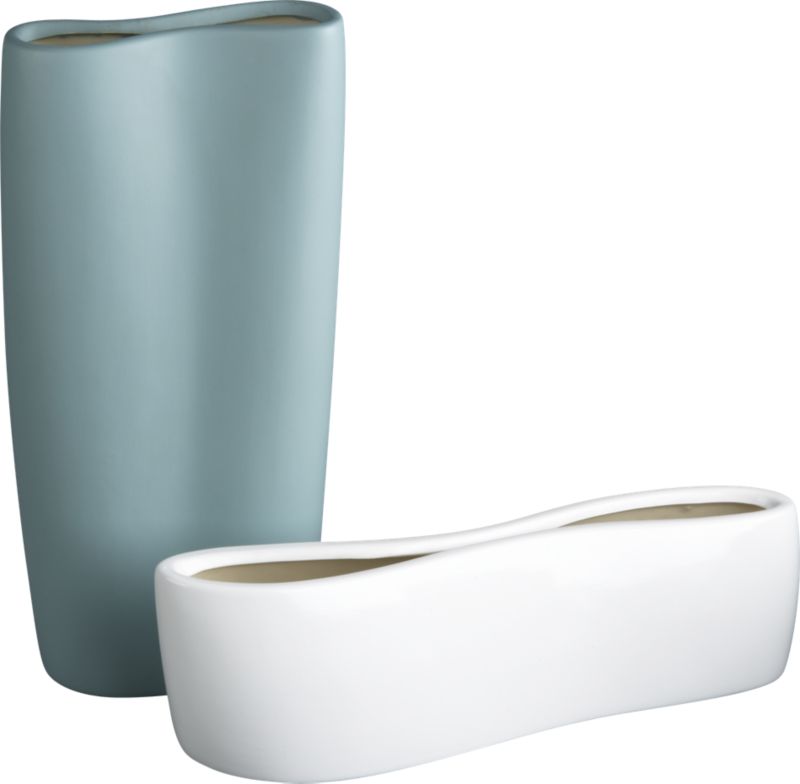 New waves. Undulating handmade stoneware vessels prop flora in a low profile gloss white or a high tide matte blue. White siphons stems to the side with double openings. Blue centers with one.• Hand-made and hand-dipped• Stoneware