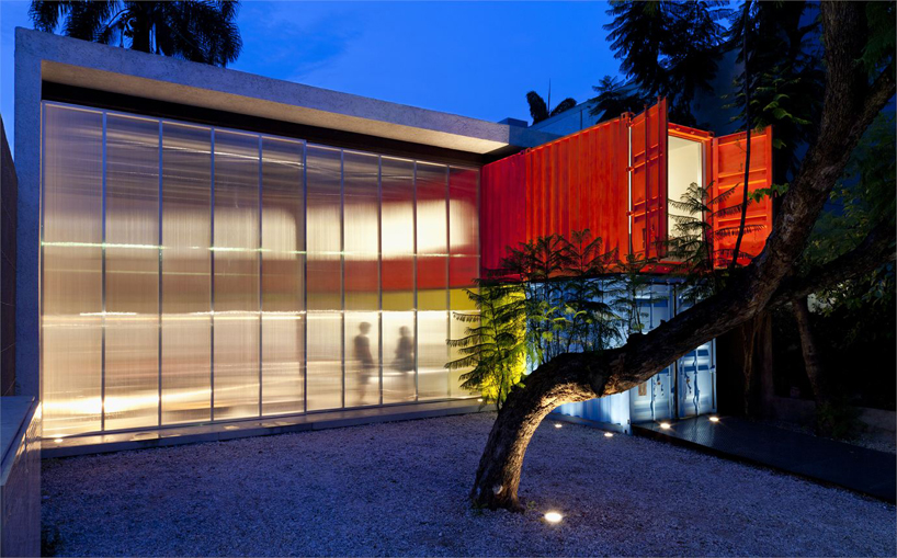 the activity within the store. at night, the polycarbonate panels glow from the interior showing shadows of people