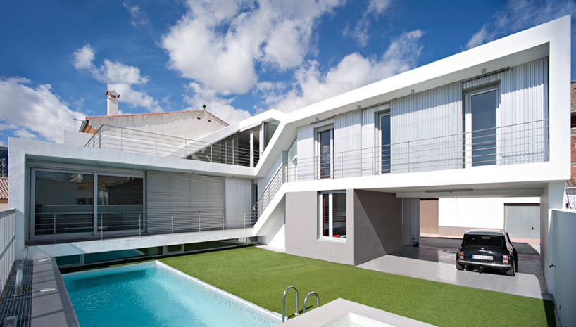 have added the 'house for maria angeles and jose' to the fray, representing the token contemporary house. the 'L' shaped plan opens to the south oriented backyard patio to which all rooms are visually connected. in section, the form contains many bends and half-levels that differentiate programmatical elements within the residence as well as sliding translucent panes that create a dynamic facade. the angle in the elevation also helps to create a seamless roof line throughout the street.